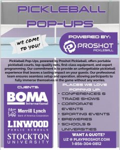 Proshot Pickleball in Egg Harbor Township offers pickleball pop-up courts, bringing top of the line equipment to wherever players desire! Check out this exclusive interview with Bob Kelly and Proshot Pickleball’s Marketing Director, Liz Katz.